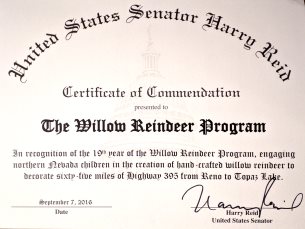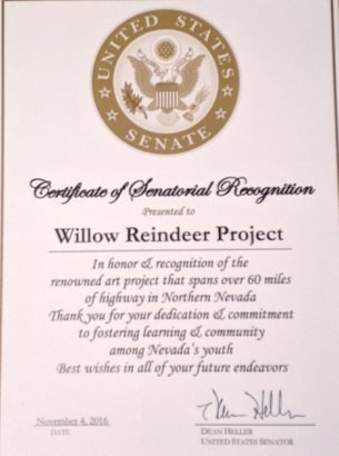 As we are reaching for our goal of nearly 85 miles (Bordertown to Topaz, on old highway 395) of dot to dot willow reindeer sculptures created by our children, over 40,000 of our children have participated in this project. Many show the pride and ownership the reindeer project by periodically calling and telling me when a reindeer is down or needs a new light.
